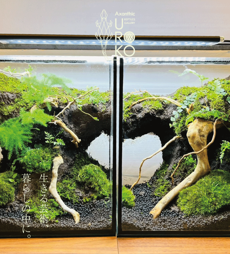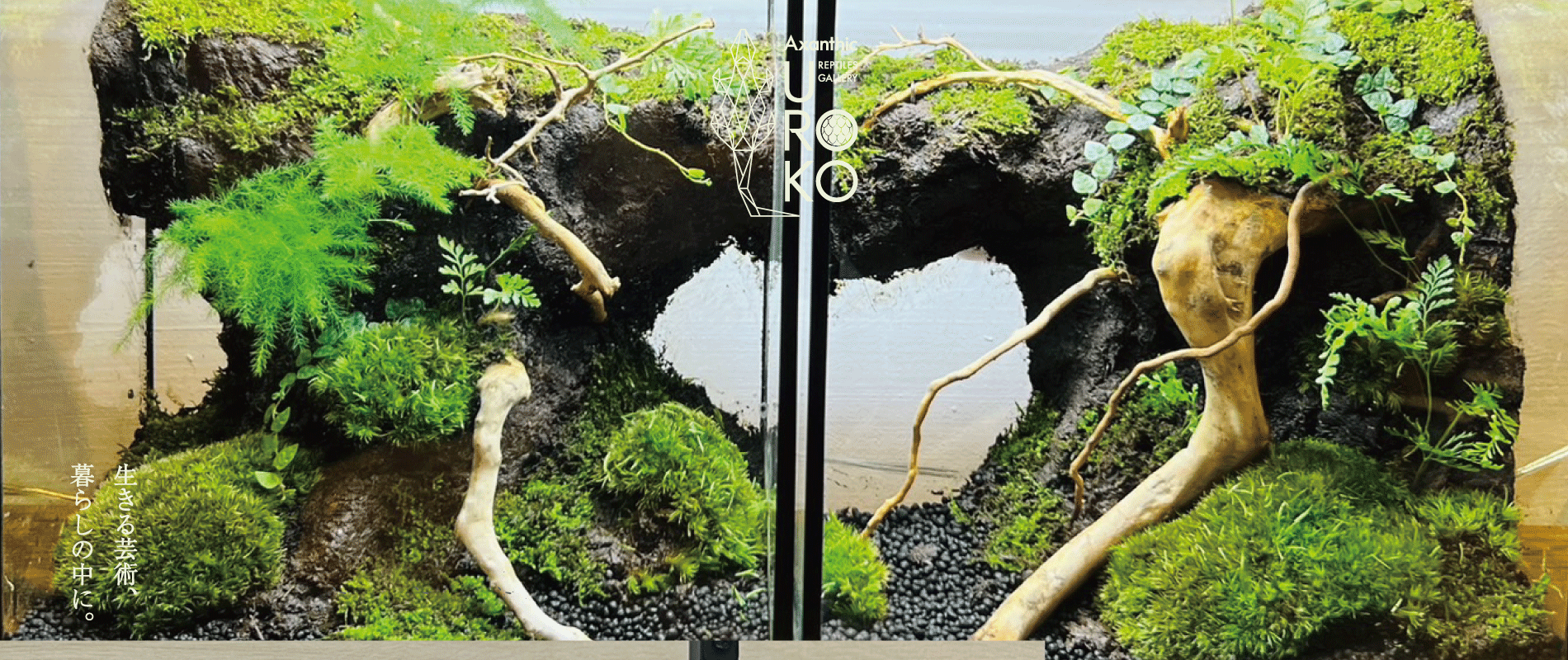 当店では、身近に存在するが故に気づきにくい日本の生きものの魅力を、パルダリウムやアクアテラリウムによる癒やしのレイアウトと共にお届けします。